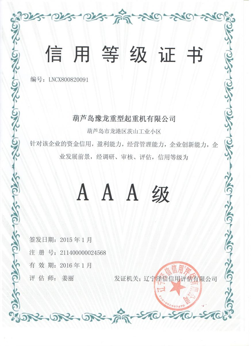 近日,經(jīng)遼寧省信用等級(jí)評(píng)定單位等一系列評(píng)審程序,葫蘆島豫龍重型起重機(jī)有限公司公司被評(píng)定為"AAA級(jí)信用企業(yè)。 葫蘆島豫龍重型起重機(jī)有限公司走品牌戰(zhàn)略之路,創(chuàng)造起重行業(yè)行業(yè)的強(qiáng)勢品牌,以"質(zhì)量、服務(wù)、信譽(yù)"為宗旨、發(fā)揚(yáng)"完善自我、挑戰(zhàn)困難"的精神,在追求經(jīng)濟(jì)效益的同時(shí),特別強(qiáng)調(diào)企業(yè)自律,建立建全信用體系,重視安全生產(chǎn)及產(chǎn)品質(zhì)量。