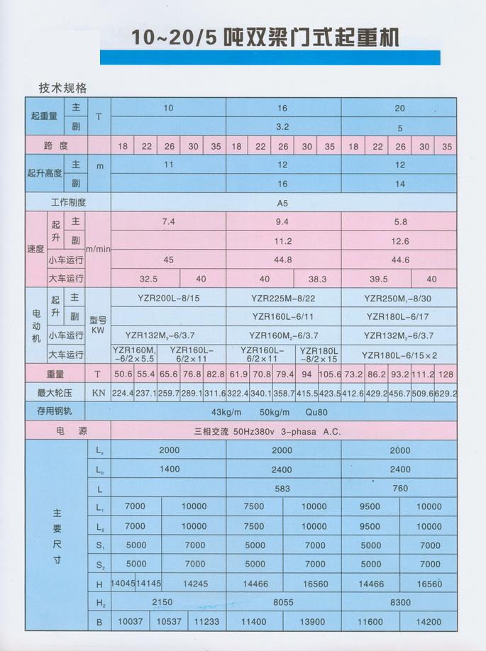 3、起重機(jī)導(dǎo)電形式分為電纜和滑線兩種,用戶可任選一種,圖表中數(shù)據(jù)以滑線為準(zhǔn)。